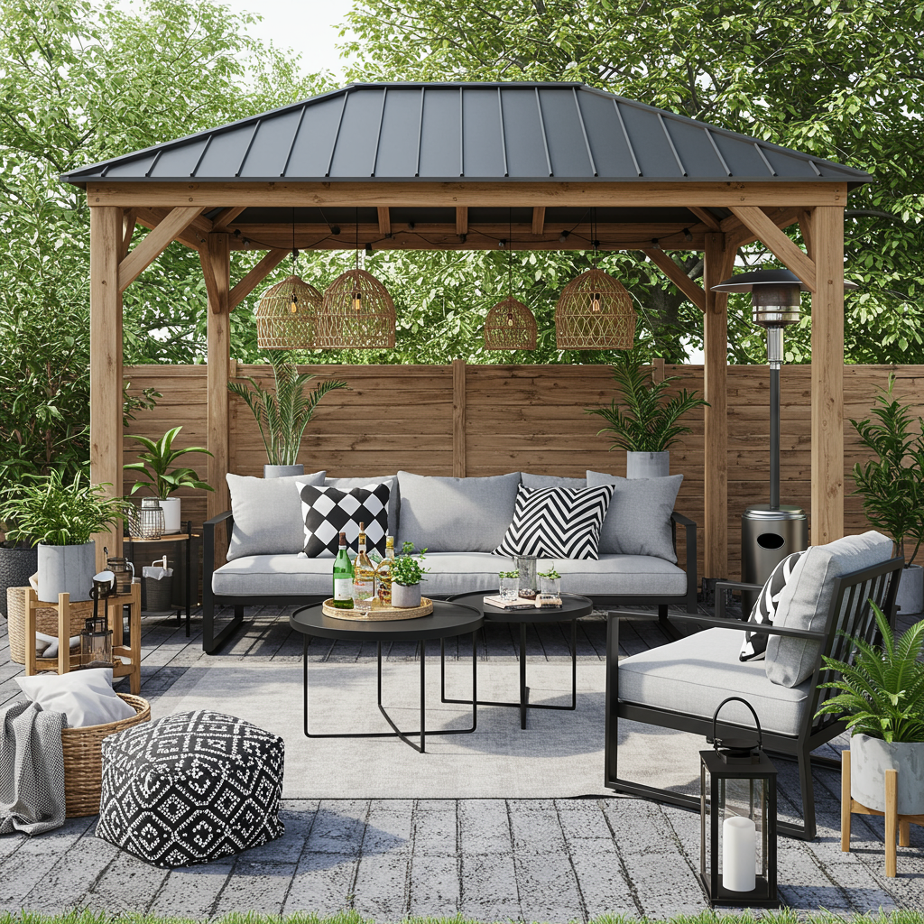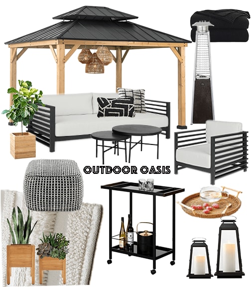 Sunjoy Pergola | Alma Ivory Fringe Outdoor Rug | Outdoor Kopelin Black Metal Sofa | Outdoor Kopelin Black Metal Chair | Cabo Large Woven Pendant Light | Cabo Small Woven Pendant Light | Black Granite Coffee Table Set | MoDRN Teak Wood Square Planter | MoDRN Elevated Teak Wood Planter (I somehow lost the link to the elevated planters on my vision board, but I linked something similar that matches the previously linked planter.) | Black Cotton Cable Knit Throw Blanket | Tomar Outdoor Black and White Pillow | Maze Outdoor Black and White Pillow | Rattan Serving Tray with Handles | Black and White Ren Pouf | City Life Bar Cart | Black LED Lantern (I also really love these candle holder lanterns!) | Black Patio Heater | Patio Furniture Covers