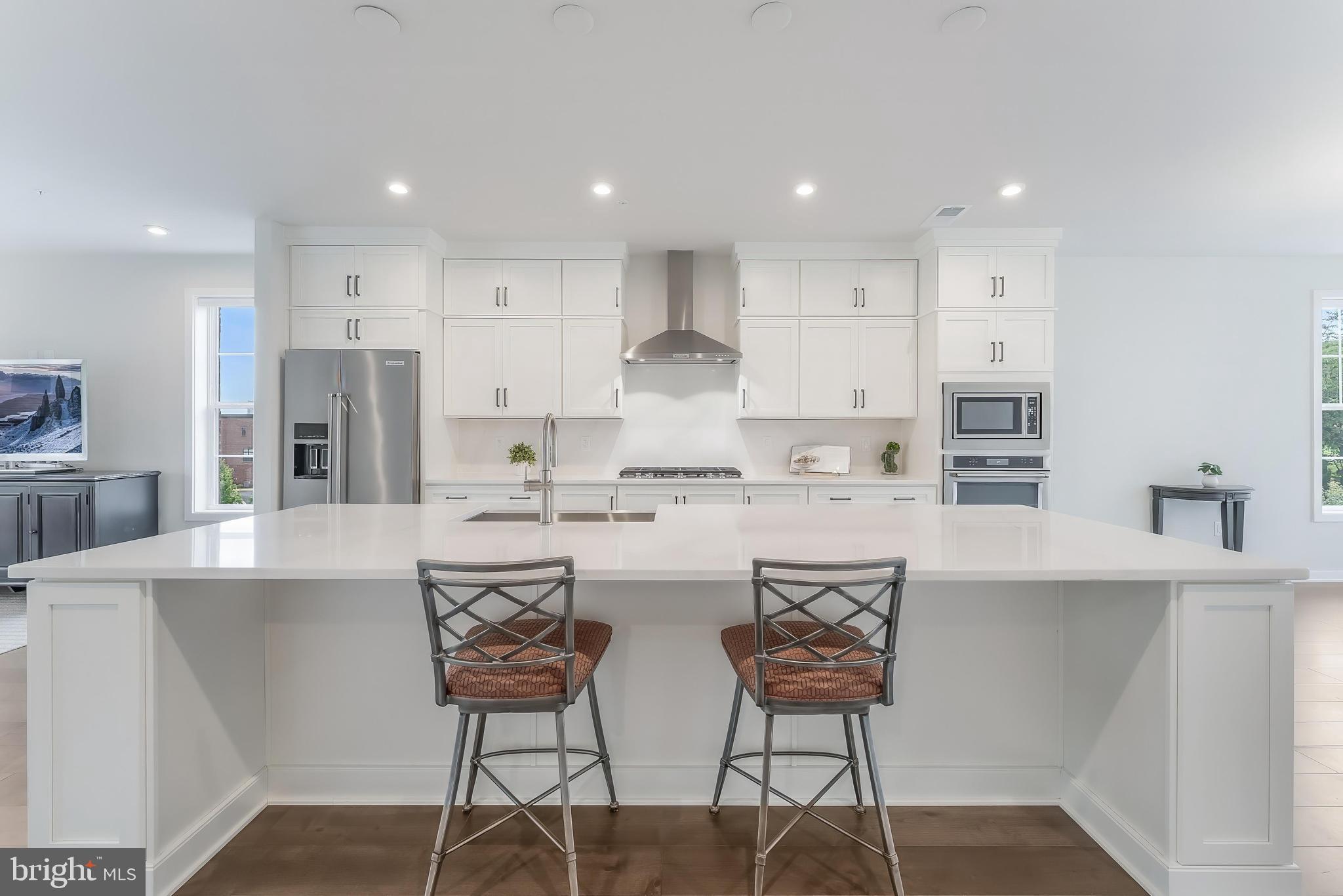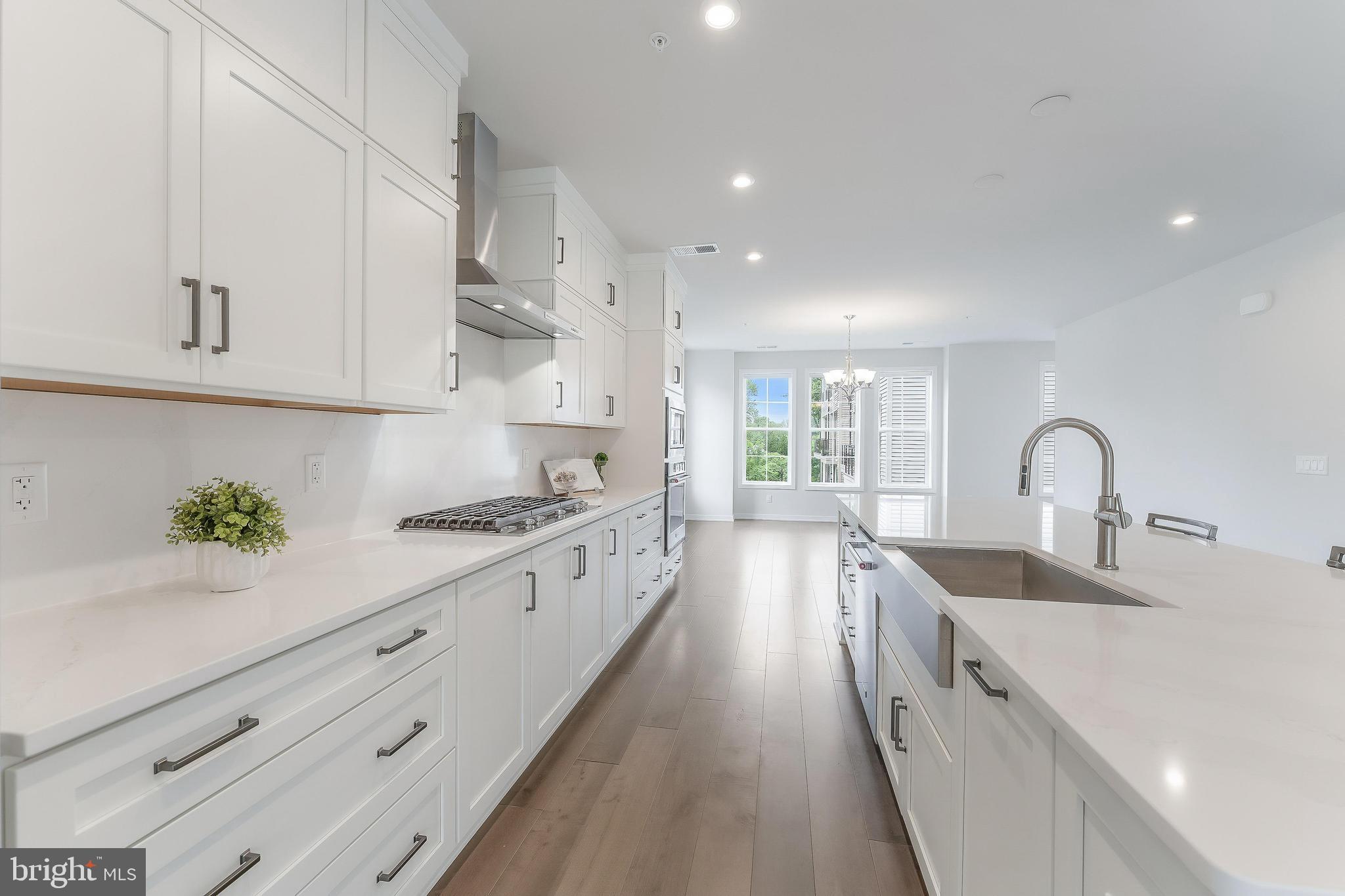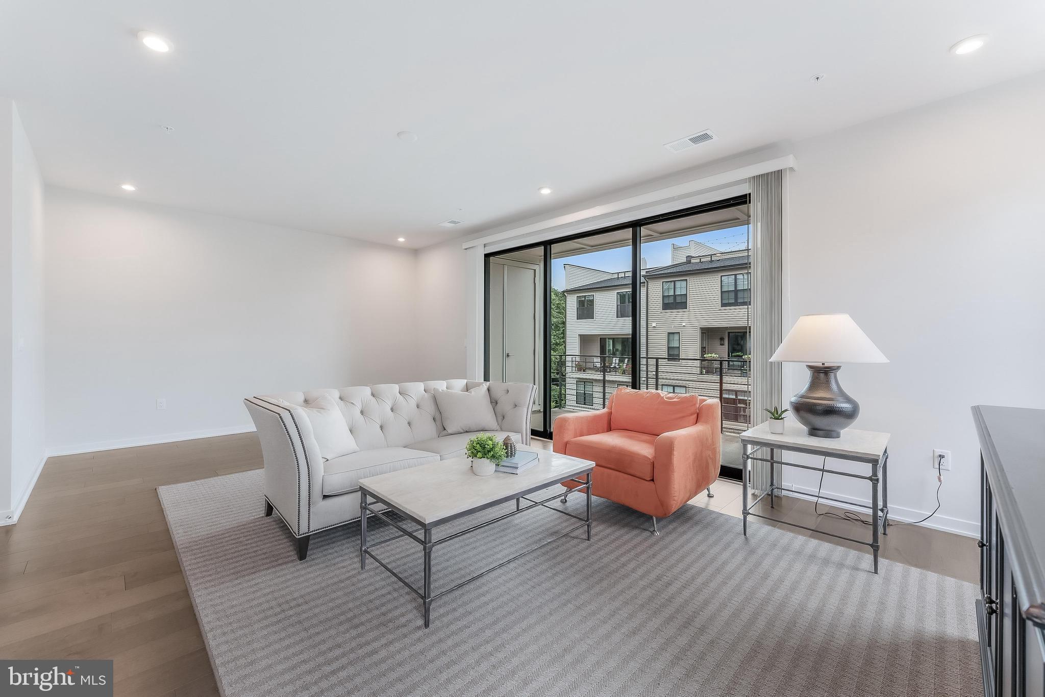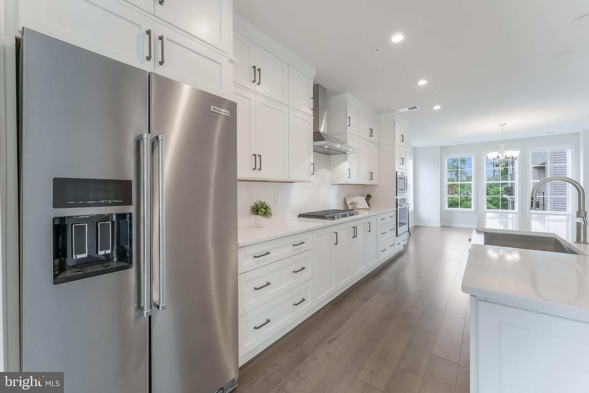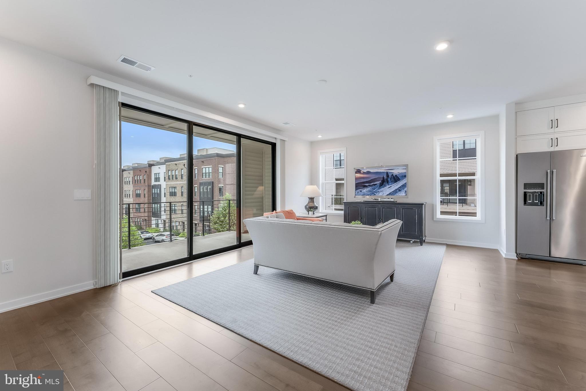 Inside, soaring ceilings, hardwood floors, and elegant moldings set a refined tone. The expansive main level features a light-filled living area that opens through sliding glass doors to an oversized balcony--perfect for indoor-outdoor entertaining. A chef's kitchen with upgraded KitchenAid appliances, quartz countertops, and abundant cabinetry flows into a chandelier-lit dining room and powder room.