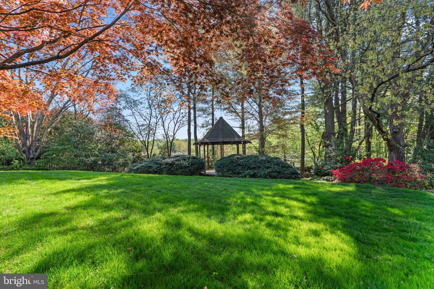 The owner's suite features a sitting room and a private upper level deck, offering a scenic view of the backyard, complete with a gazebo and koi pond. Four more generously sized secondary bedrooms are served by two hall bathrooms and provide ample accommodations for family and guests.