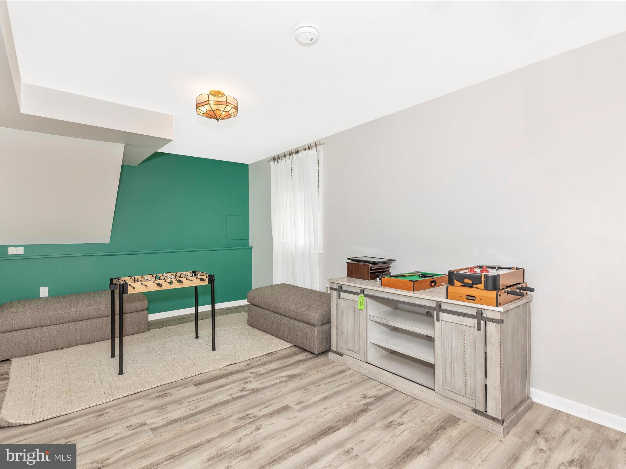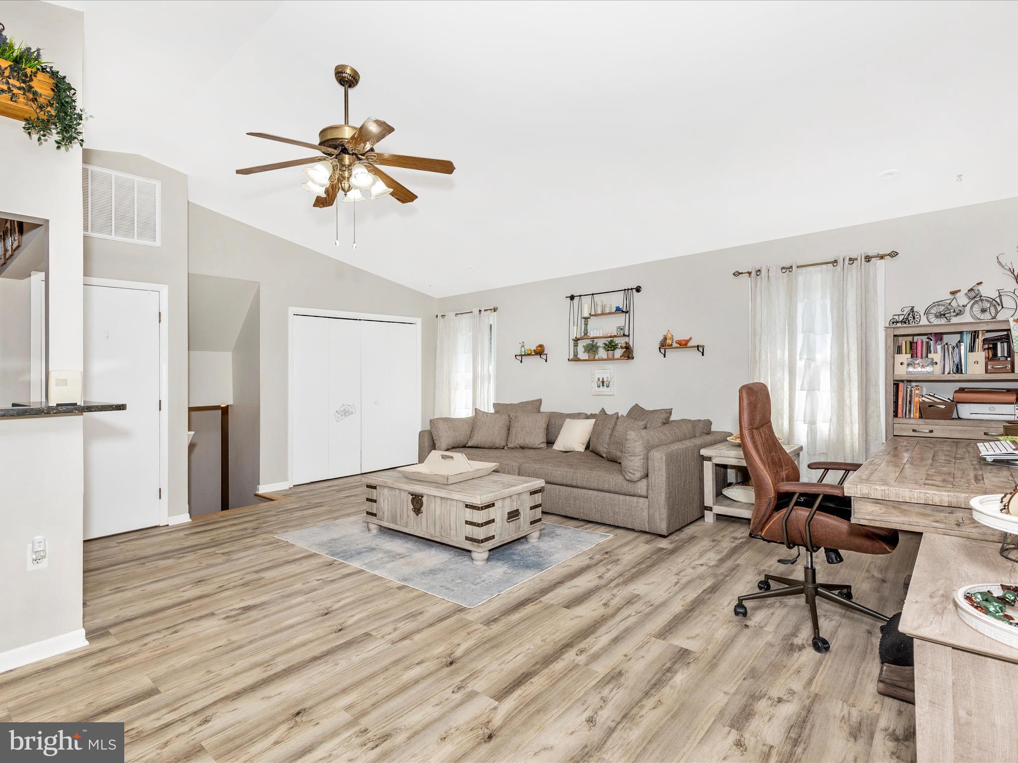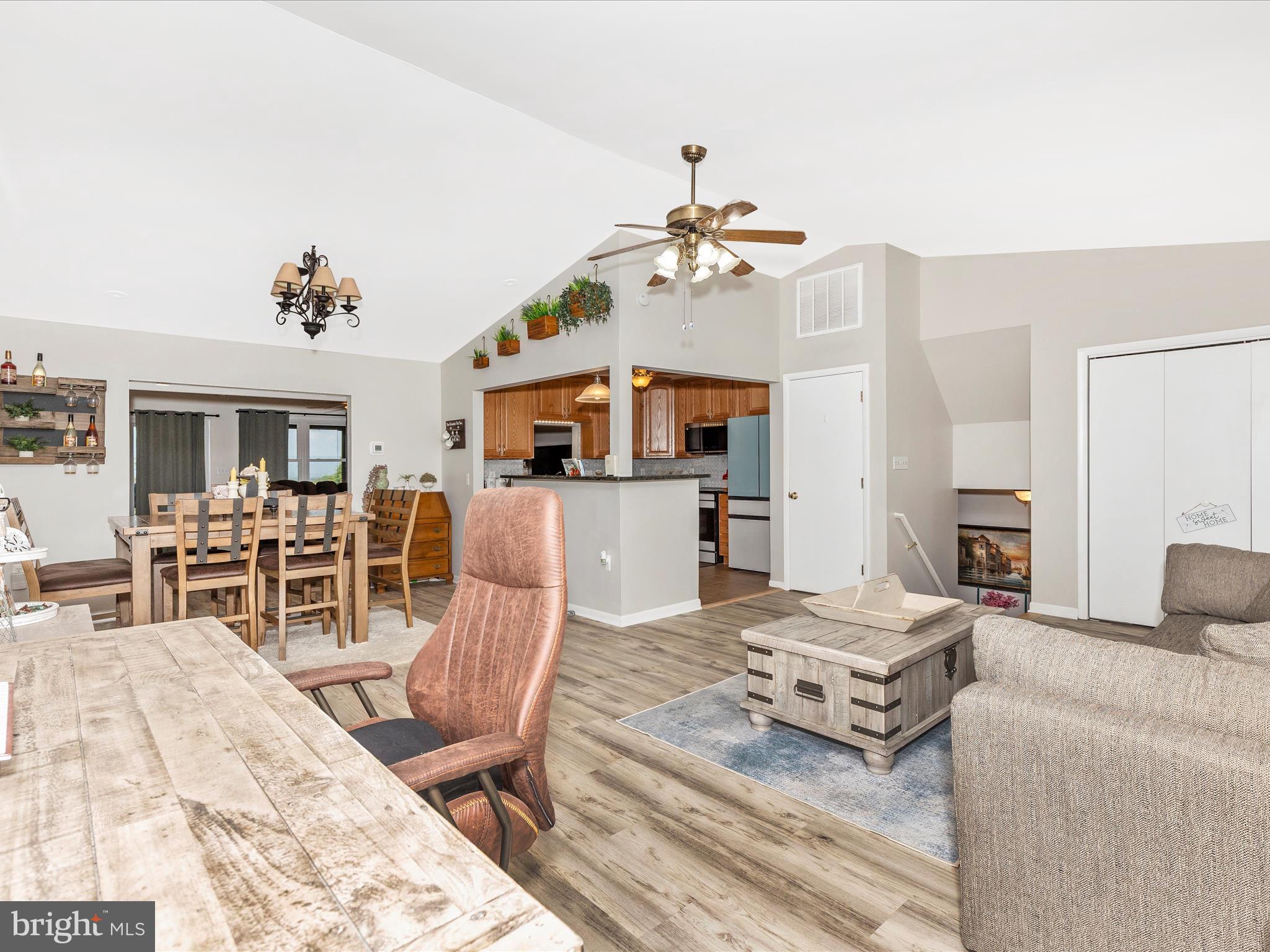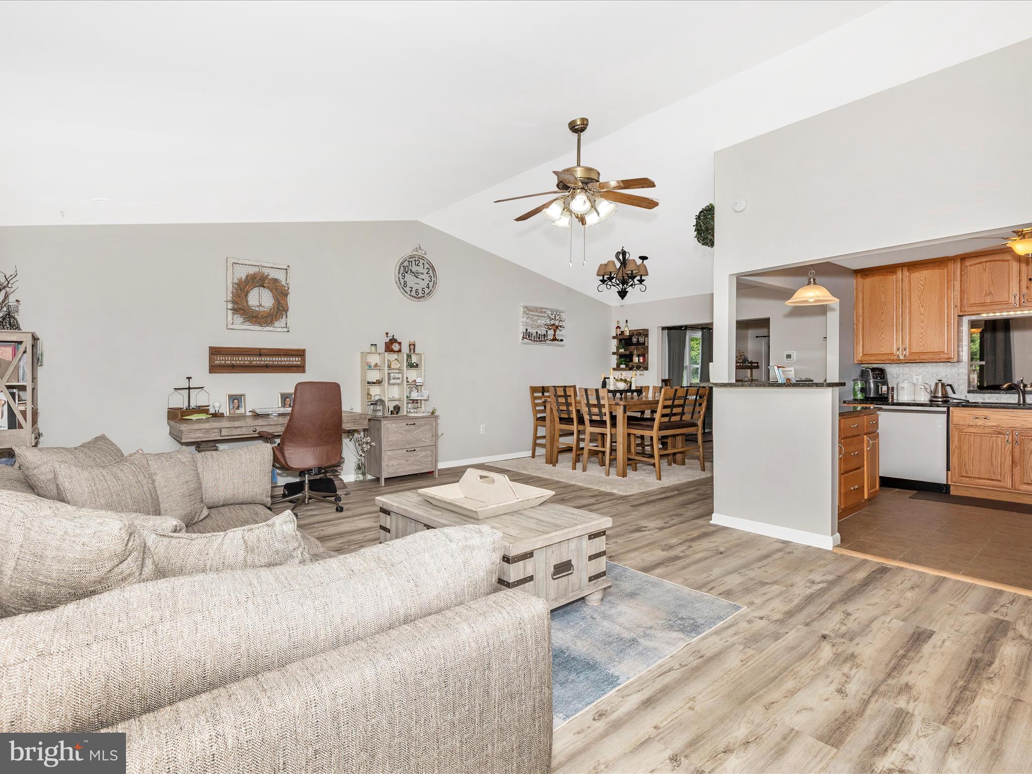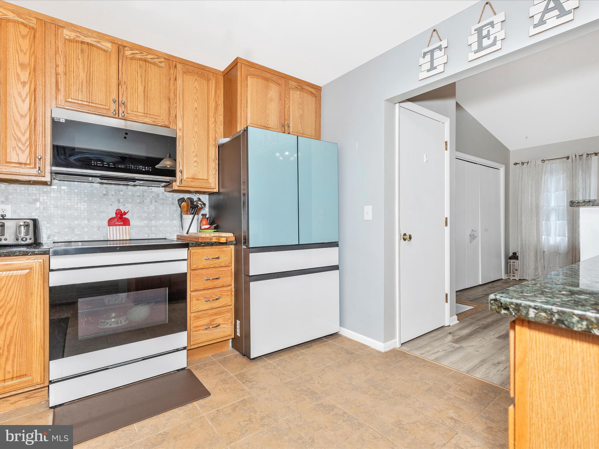 Upstairs, vaulted ceilings and natural light flood the main living area. The open-concept layout connects the living and dining spaces to the kitchen, which is centrally located for entertaining. Featuring new, app-ready smart appliances and piped for future gas conversion, the kitchen flows into a cozy family room through a convenient pass-through window.